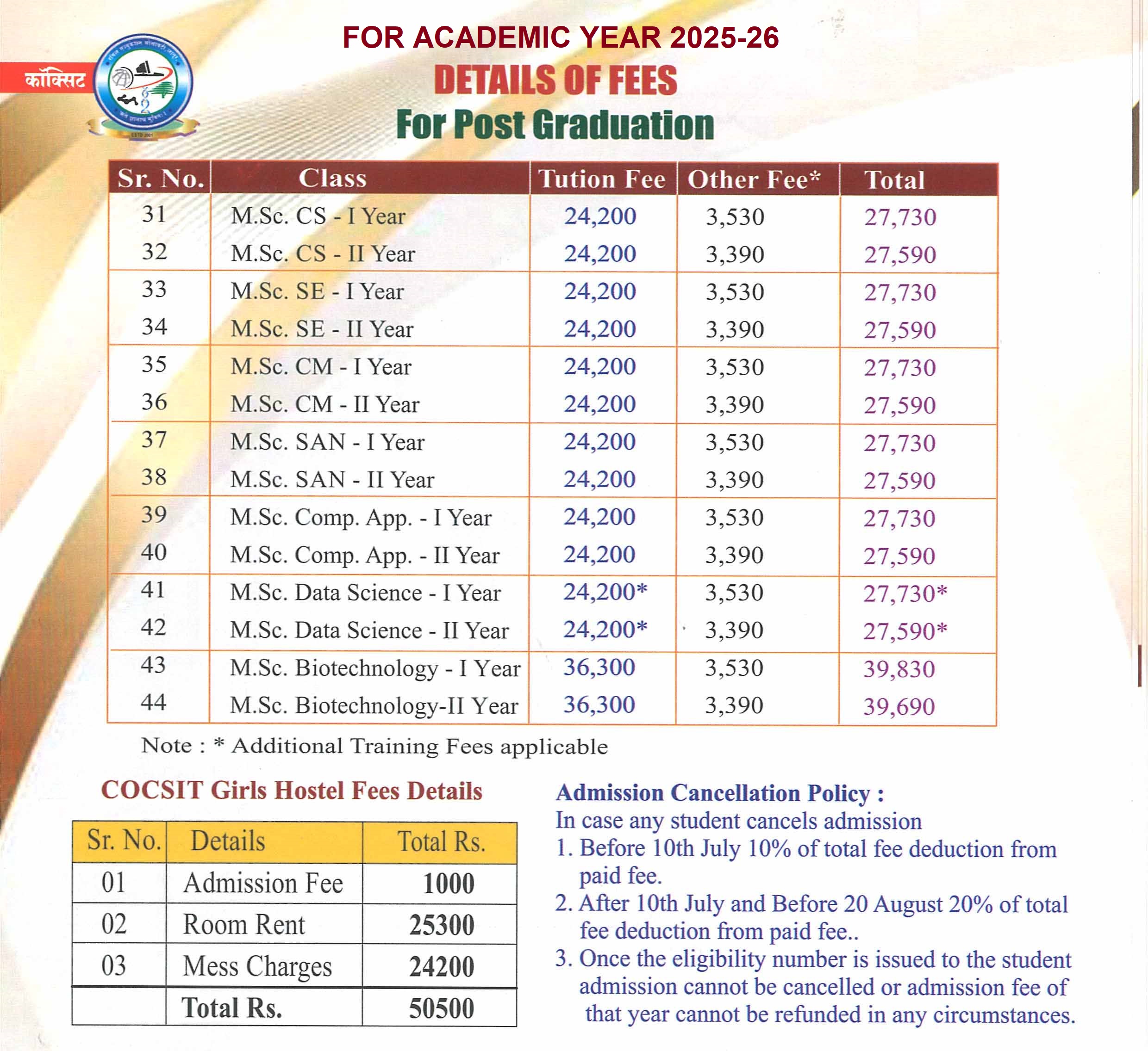 PG - Fees Structure for Academic year 2025-26