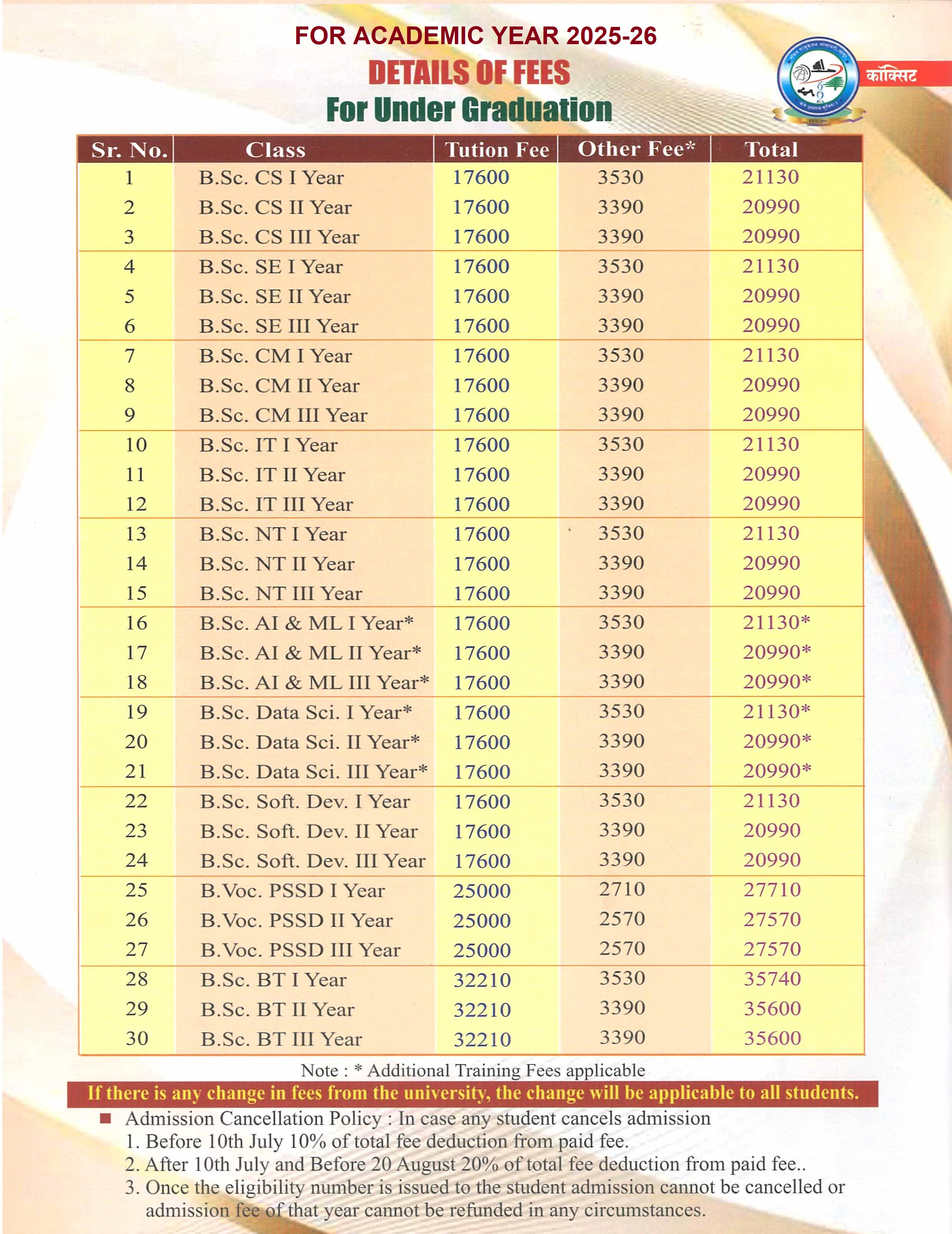 UG - Fees Structure for Academic year 2025-26